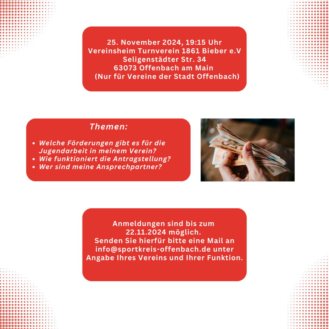 Aus genau diesem Grund lädt der Sportkreis alle Vereine der Stadt Offenbach ein, im Rahmen einer kostenlosen Informationsveranstaltung, die nötige Orientierung und Hilfestellung zu diesen Angelegenheiten zu erhalten. Die kurzweilige Veranstaltung soll Vereine dabei unterstützen, sich mit den Fördermöglichkeiten der Stadt Offenbach, des Landes Hessen und des Bundes vertraut zu machen, die speziell auf die Bedürfnisse der Jugendarbeit der Vereine zugeschnitten sind.